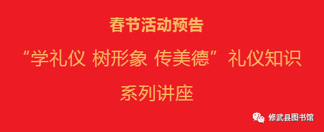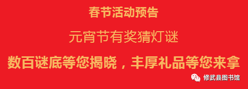 为弘扬优秀的传统民族文化,更好地满足人民群众精神文化需求,营造春节喜气祥和的浓厚氛围,2月5日起,修武县图书馆将让读者们放慢脚步,回归最古朴的春节,开启“阅享新春”之旅。精彩活动大幕已开启,修武县图书馆欢迎您的到来!