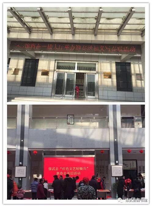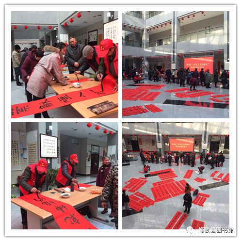 为深入贯彻落实党的十九大精神,进一步推进全民阅读推广活动,丰富春节期间基层群众文化生活,营造喜庆、祥和、文明的节日文化氛围,2018年2月8日,“迎春送福 义写春联”活动在修武县图书馆一楼大厅举行,县老年书画研究会李安平、马玉生、姜利民、祝丙山、刘明晗、王希功、苏麦收、马有旺、董明周、马炳臣、朱彦昌、刘长兴、郑庆刚共13名著名书法家出席活动,并纷纷献出自己的墨宝。由此拉开了2018年春节文化惠民活动的序幕。